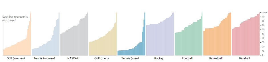 Όπως μπορείτε να δείτε από το παραπάνω γράφημα η διαφορά στις απολαβές τόσο στο τένις ανδρών όσο και σε εκείνο των γυναικών είναι τεράστια και μπορεί να συγκριθεί μόνο με το γυναικείο γκολφ. Στο Νο1 των εσόδων στους άνδρες είναι ο Νόβακ Τζόκοβιτς με επτά εκατομμύρια δολάρια, ενώ ο Φερνάντο Βερντάνσκο πήρε 757.446 δολάρια.