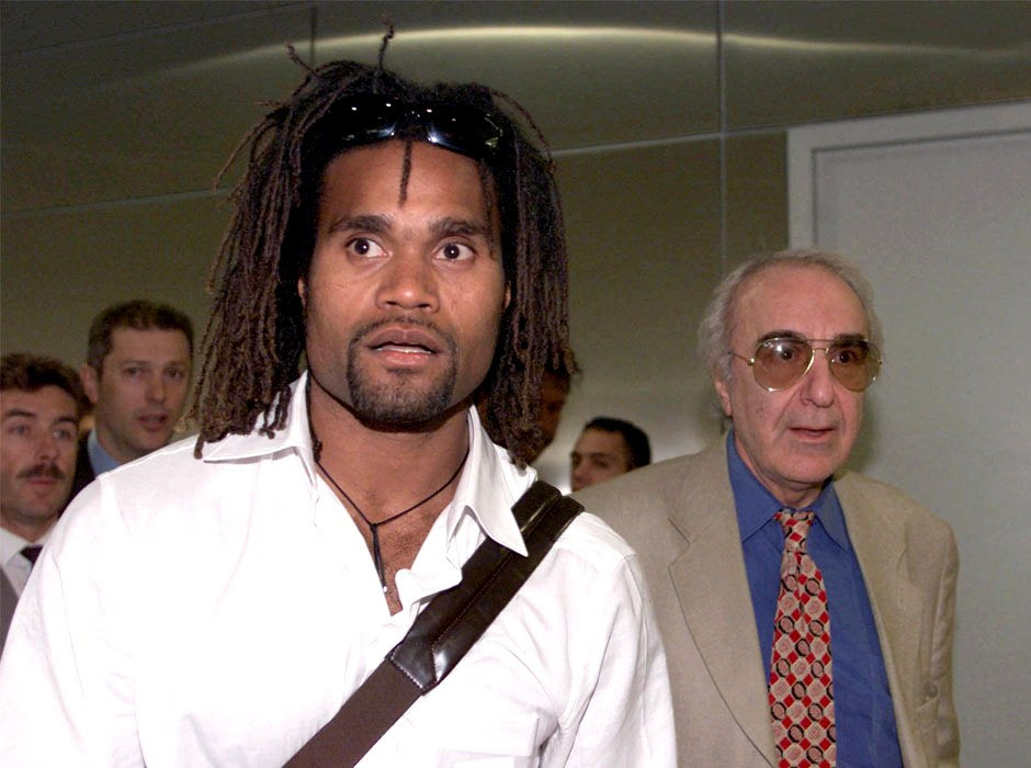 Ο Κριστιάν Καρεμπέ φτάνει στην Ελλάδα. Πίσω δεξιά, ο Γιώργος Λούβαρης (2001)