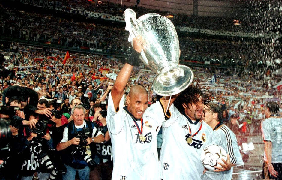 Ανελκά και Καρεμπέ, οι δυο Γάλλοι της Ρεάλ, πανηγυρίζουν την κατάκτηση του Τσάμπιονς Λιγκ της σεζόν 1999/2000 στο “Σταντ ντε Φρανς” της γαλλικής πρωτεύουσας