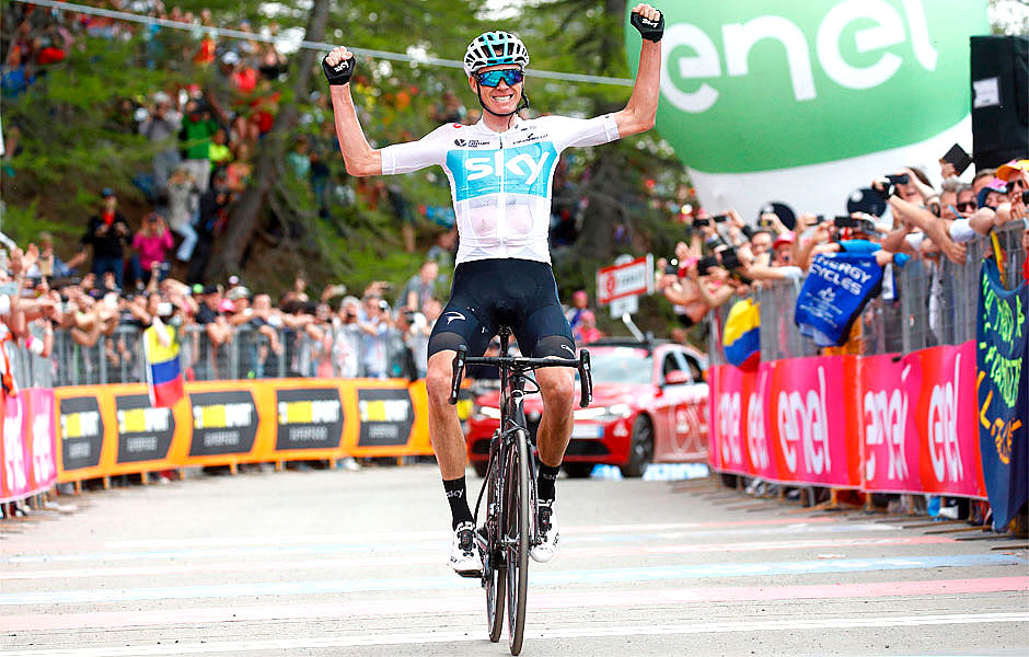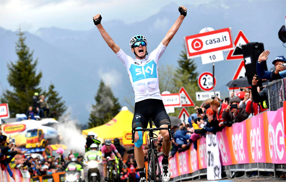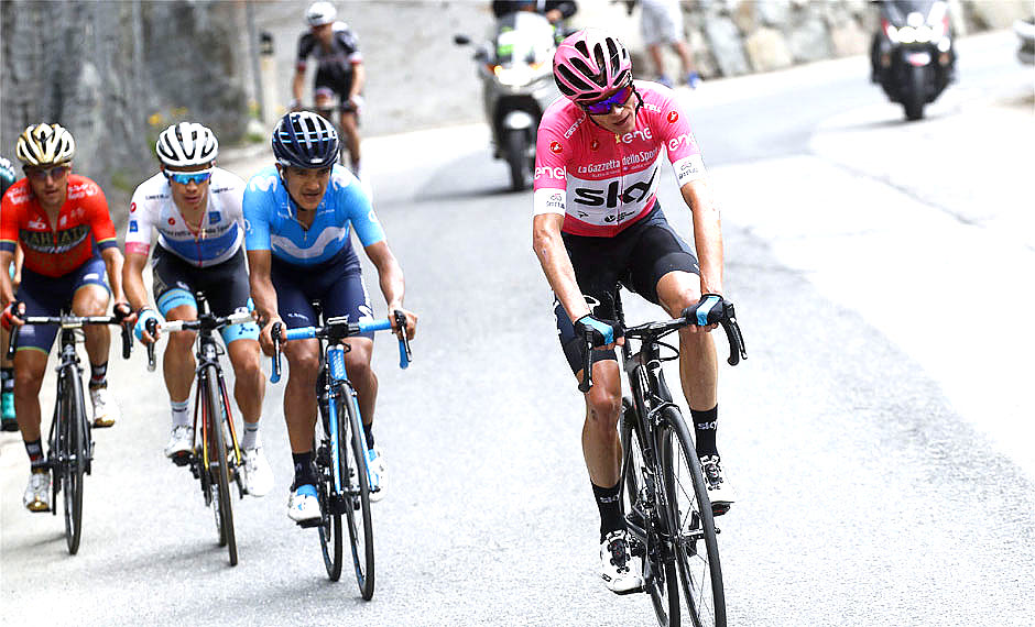 Ο Κρις Φρουμ στην Τσερβίνια, την τελευταία ανηφόρα του φετινού Giro, λίγο πριν σφραγίσει την κατάκτηση της ροζ φανέλας. Πίσω του, οι Καραπάς, Λόπες και Ποτσοβίβο, ενώ ακόμα πιο πίσω, διακρίνεται ο Τομ Ντιμουλάν.