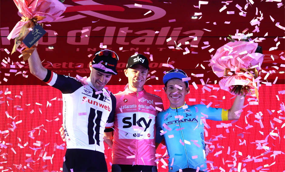 Ο 101ος Γύρος της Ιταλίας ολοκληρώθηκε χθες στη Ρώμη με μεγάλο νικητή τον Κρις Φρουμ της Sky, τον πρώτο Βρετανό που κατακτά τον συγκεκριμένο αγώνα. Στο τελικό βάθρο τον πλαισίωσαν ο Τομ Ντιμουλάν της Sunweb και ο Μιγκέλ Άνχελ Λόπες της Astana. Ο αρχηγός της Sky κέρδισε και τη μπλε φανέλα των βουνών, ενώ ο Ελία Βιβιάνι (Quick Step) κέρδισε τη μωβ φανέλα των πόντων. Ο Μιγκέλ Άνχελ Λόπες (Astana) ήρθε πρώτος στην κατάταξη του καλύτερου νέου αθλητή (λευκή φανέλα). Πολυνίκης της διοργάνωσης ήταν ο Ελία Βιβιάνι της Quick Step με 4 κερδισμένα ετάπ και η Sky κέρδισε την ομαδική κατάταξη. Η Quick Step και η Mitchelton Scott ήταν οι δυο ομάδες με τα περισσότερα κερδισμένα ετάπ, από 5 έκαστη. Μετά από 24 μέρες αγώνα, 21 ετάπ και 3.577 χιλιόμετρα, ένας ακόμα Γύρος Ιταλίας έφτασε στο τέλος του και το Sport24.grσας παρουσιάζει την ανασκόπηση του αγώνα. Οι εντυπώσεις, η εξέλιξη, οι πρωταγωνιστές, οι νικητές.