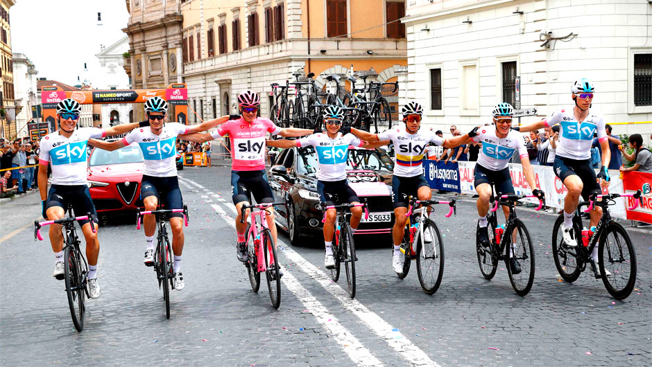 Ο Κρις Φρουμ και οι υπόλοιποι αθλητές της Sky πανηγυρίζουν τη νίκη τους στο φετινό Giro d’Italia.