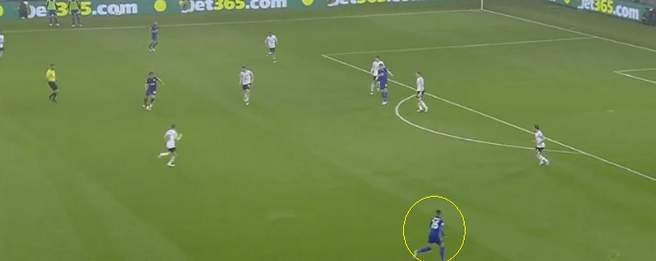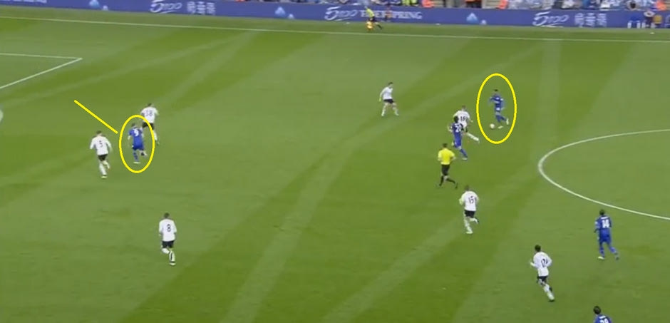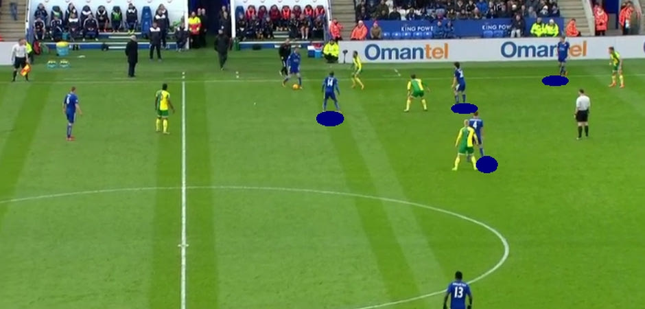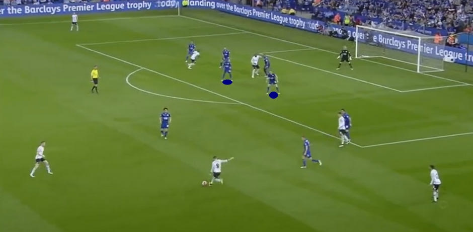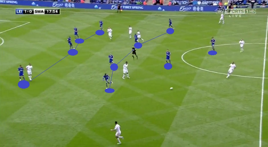 Τέλος, στόχος των παικτών της Λέστερ ήταν να μην αφήσουν τον αντίπαλο να αναπτυχθεί με προϋποθέσεις και με την μπάλα κάτω από πίσω, αλλά να τον οδηγήσουν σε διεκδικήσιμες μπαλιές, πιέζοντας με τους δύο φορ τους στόπερ του αντιπάλου χωρίς όμως να μετακινείται ψηλά και η μεσαία ζώνη.