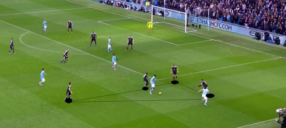 Η τοποθέτηση των Ντρινκγουότερ και Καντέ ήταν καταλυτική στο να κλείνουν καλά οι χώροι στον άξονα , οδηγώντας τον αντίπαλο να παίξει από τα πλάγια. Η παρουσία τους κοντά στους κεντρικούς αμυντικούς τους επέτρεψαν να κερδίσουν τα αμυντικά rebound και να βγάλουν την ομάδα γρήγορα στην επίθεση με μακρινές πάσες προς τον Βάρντι (κυρίως από τον Ντρινκγουότερ ). Επιπλέον, στις περιπτώσεις που ο αντίπαλος έπαιζε με δύο επιθετικούς βρίσκονταν στο κέντρο της άμυνας για να μην αφήσουν εκτεθειμένους τους στόπερ 2ν2.