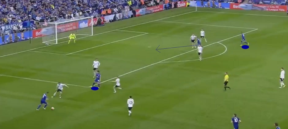 Στην επίθεση συμμετείχαν οι πλάγιοι αμυντικοί και οι κεντρικοί μέσοι χωρίς όμως να κάνουν ταυτόχρονες προωθήσεις και οι δύο στην ίδια πτέρυγα. Οι ακραίοι μέσοι έπαιζαν με ανάποδα πόδια, έκλειναν προς τον άξονα και έκαναν σέντρα με στόχο τον Βάρντι που βρισκόταν ανάμεσα στον στόπερ και τον ακραίο μπακ της απέναντι πλευράς. Ο Οκαζάκι έκανε κίνηση στα πλάγια τραβώντας μαζί του τον στόπερ και δημιουργώντας κενό χώρο για να κινηθεί ο Βάρντι στην αντίπαλη περιοχή.