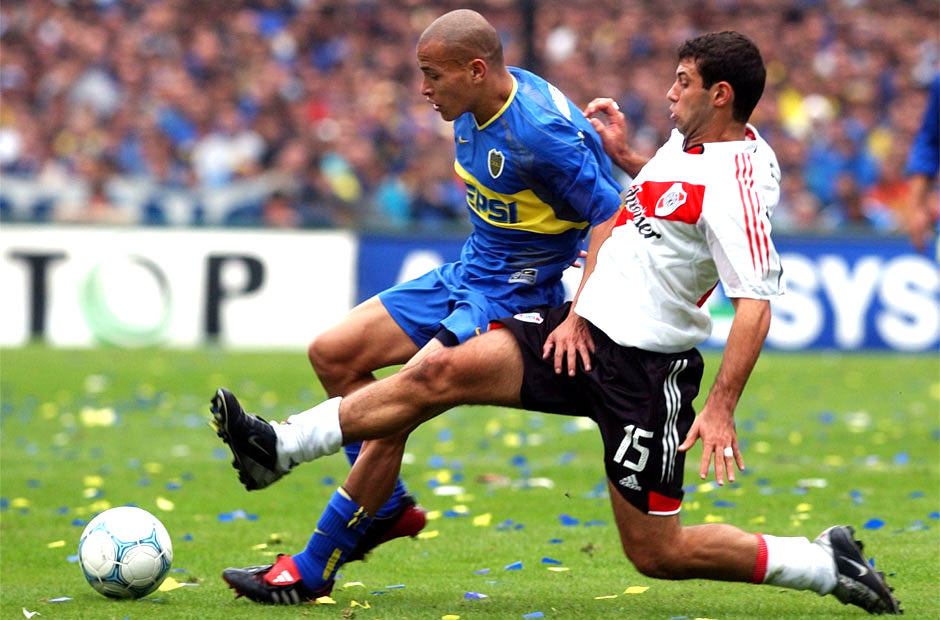 Ο Μαστσεράνο (δεξιά) με αντίπαλο τον Κλεμέντε Ροντρίγκες, σε superclásico του 2004 ανάμεσα στην Μπόκα Τζούνιορς και τη Ρίβερ Πλέιτ στην “Μπομπονέρα” (AP Photo/Natacha Pisarenko)