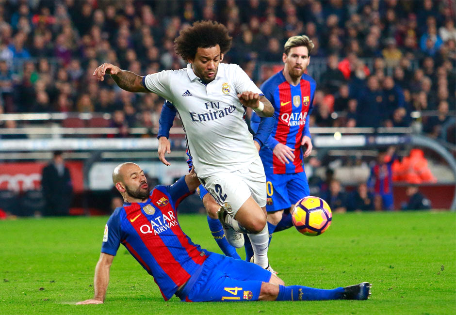 Ο Μαστσεράνο με αντίπαλο τον Μαρσέλο, ενώ ο Μέσι παρακολουθεί την εξέλιξη, σε clásico στο “Καμπ Νόου” (3/12/2016)