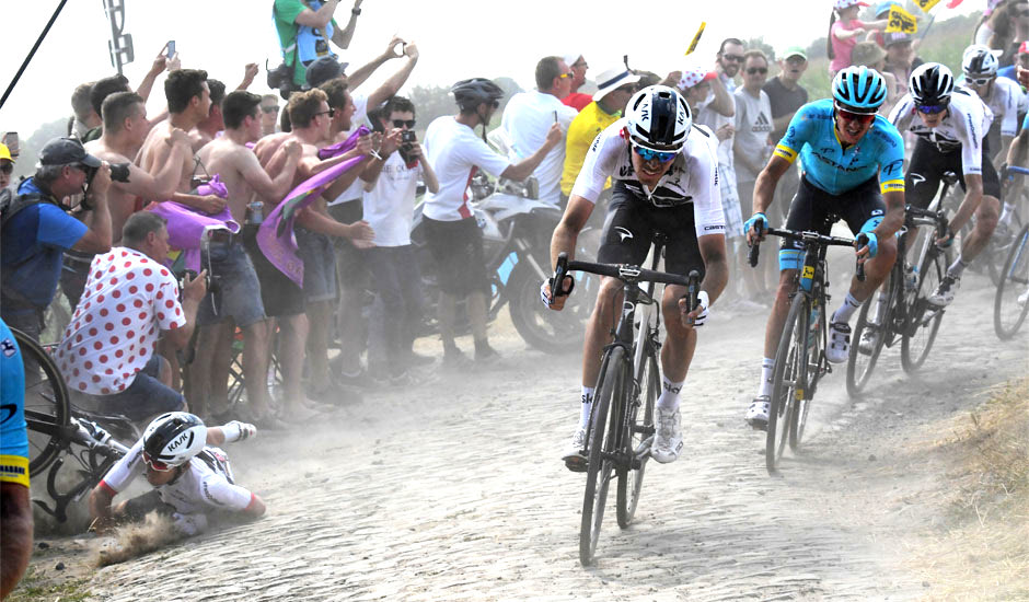 “Θύμα” της ημέρας ήταν ο Νταν Μάρτιν, που είχε πτώση 16 χλμ πριν τον τερματισμό και έχασε τελικά 1.16″ από τους υπόλοιπους διεκδικητές. Κάπως έτσι φτάσαμε στο 9ο ετάπ, από το Αράς στο Ρουμπέ (156.5 χλμ), τον μεγάλο “εφιάλτη” όλων των φαβορί λόγω των 21.7 χλμ με παβέ, που ήταν συγκεντρωμένα στα τελευταία εκατό χλμ της διαδρομής. Πριν καν φτάσουμε στα λιθόστρωτα, το Tour είχε την πρώτη του μεγάλη απώλεια. Ο Ρίτσι Πορτ, ένα από τα φαβορί πρώτης γραμμής, είχε πτώση και εγκατέλειψε με σπασμένη την κλείδα του ( για δεύτερη σερί χρονιά στο 9ο ετάπ!). Από εκεί και μετά, οι συνεχείς πτώσεις και τα αμέτρητα μηχανικά προβλήματα (κυρίως σκασμένα ελαστικά), έγιναν οι πρωταγωνιστές της ημέρας. Τα περισσότερα φαβορί είχαν απρόοπτα στη διάρκεια της διαδρομής, είτε πτώσεις (Τόμας, Φρουμ, Ουράν, Λάντα), είτε μηχανικά (Μπαρντέ). Το ετάπ εξελίχθηκε σε ένα διαρκές “ο σώζων εαυτόν σωθήτω”, με τον Τζον Ντέγκενκολμπ να περνάει πρώτος τη γραμμή του τερματισμού και να πανηγυρίζει έξαλλα τη νίκη του, την πρώτη σε μεγάλο Γύρο μετά από τρία χρόνια.