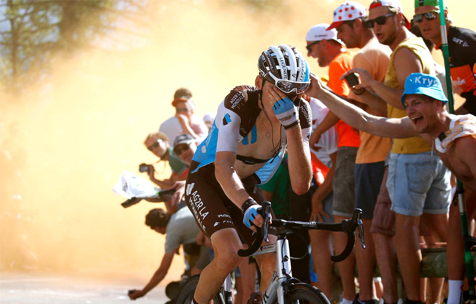 Ο Ρομέν Μπαρντέ (Ag2r) προσπαθεί να αναπνεύσει εξερχόμενος από το νέφος των καπνογόνων που κάποιοι κλινικά ηλίθιοι άναψαν στην ανηφόρα του Αλπ ντ’Ουέζ (AP Photo/Peter Dejong)