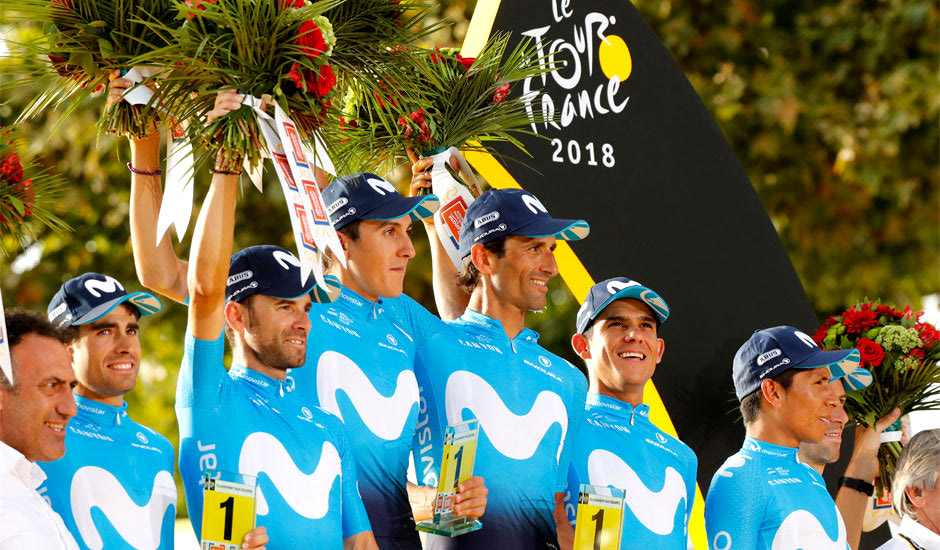 Οι αθλητές της Movistar παραλαμβάνουν το βραβείο της ομαδικής κατάταξης (AP Photo/Laurent Rebours)
