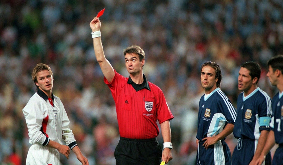 Ο αρχηγός της “αλμπισελέστε” διαισθάνθηκε την επαφή και με την τεράστια εμπειρία του στα γήπεδα έπεσε στο έδαφος προσποιούμενος πως δέχτηκε δυνατό χτύπημα, οι παίκτες της Αργεντινής περικύκλωσαν τον Κιμ Μίλτον Νίλσεν απαιτώντας την τιμωρία του Μπέκαμ και ο Δανός δεν είχε άλλη επιλογή από το να του δείξει την απευθείας κόκκινη κάρτα .