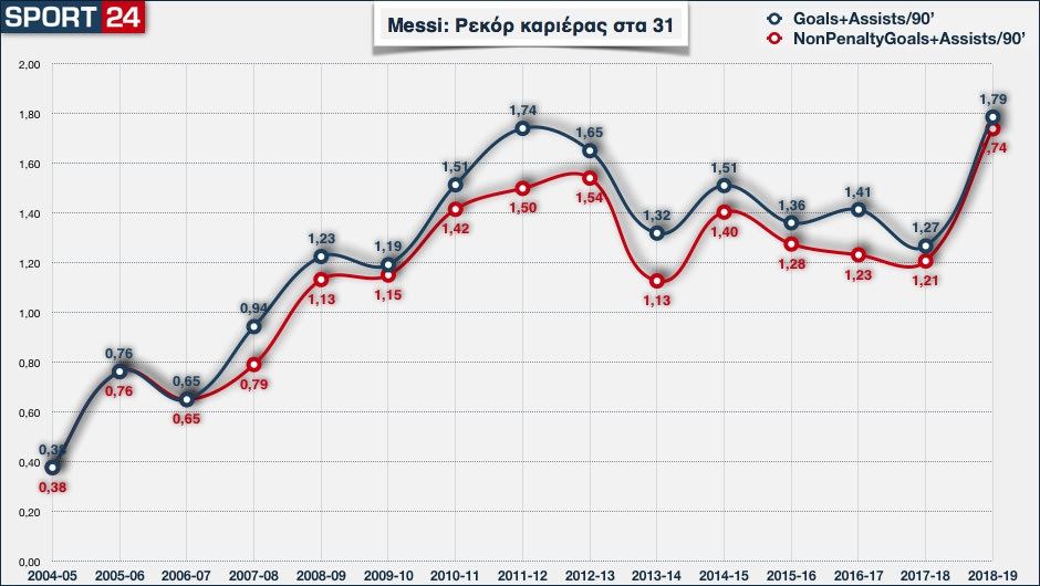Όλα αυτά μαζί φέρνουν τον Μέσι να έχει τον ασύλληπτο μέσο όρο των 1.79 γκολ+ασίστ ανά 90’. Τι σημαίνει 1.79 ανά 90’; Πως ο Αργεντινός έχει άμεση συμμετοχή σε γκολ κάθε 50 αγωνιστικά λεπτά. Και αυτή η επίδοση είναι η καλύτερη που είχε μέχρι σήμερα στην εκπληκτική καριέρα του.