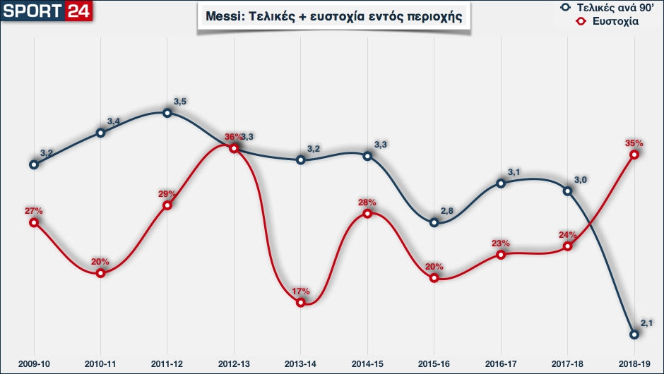 Στις προηγούμενες εννέα σεζόν, ο Μέσι είχε κατά μέσο όρο 3.2 τελικές εντός περιοχής στο πρωτάθλημα, χωρίς να μετράμε τα πέναλτι. Φέτος στη La Liga έχει πέσει σε ιστορικό χαμηλό, αφού οι τελικές εντός περιοχής είναι μόλις 2.1 ανά 90’.