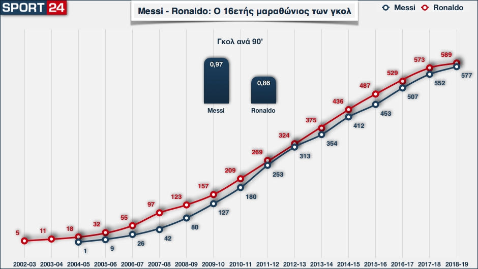 Στο σύνολο των γκολ ο Μέσι είναι πίσω από την αρχή. Λογικό, αφού ο Πορτογάλος ξεκίνησε δύο χρόνια νωρίτερα και συνολικά έχει παίξει πάνω από 10.000 λεπτά περισσότερα από τον Αργεντινό. Οι δυο τους ήρθαν πιο κοντά το 2013, όταν ο Μέσι αποφάσισε να σπάσει τα κοντέρ και να βάλει 186 γκολ σε τρεις σεζόν. Από τότε ο Ρονάλντο κατάφερε να επαναφέρει τη διαφορά σε +20 γκολ και πλέον τους χωρίζουν “μόνο” 12.