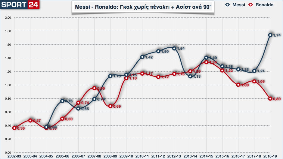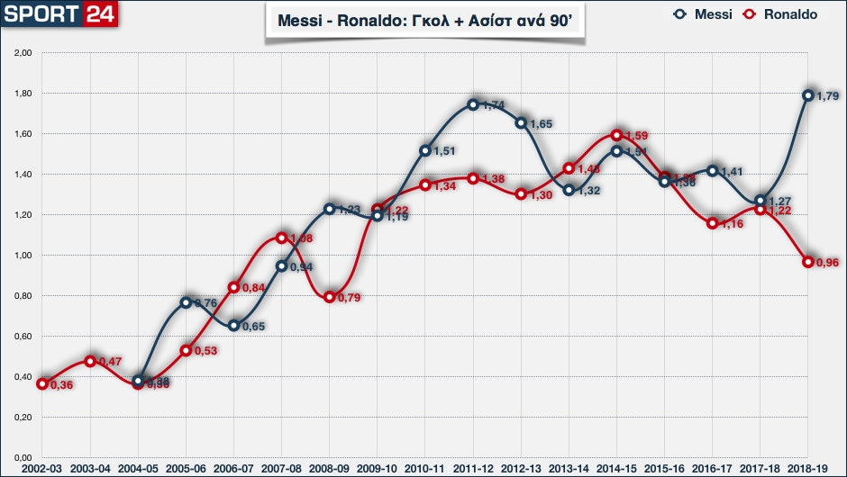 Μιλάμε για πράγματα που δύσκολα θα δούμε ξανά στο ποδόσφαιρο. Από το καλοκαίρι του 2009 όλες οι σεζόν έχουν Μέσι και Ρονάλντο με μέσο όρο πολύ πάνω από 1 γκολ+ασίστ ανά παιχνίδι. Ο Μέσι το “τερμάτισε” την τριετία 2010-13, ο Ρονάλντο βγήκε μπροστά τη διετία 2013-15. Από τότε οι δυο τους έχουν σταδιακή πτώση (πάντα βέβαια με world class επιδόσεις), μέχρι που φέτος ο Αργεντινός αποφάσισε να γίνει ξανά 25-26.