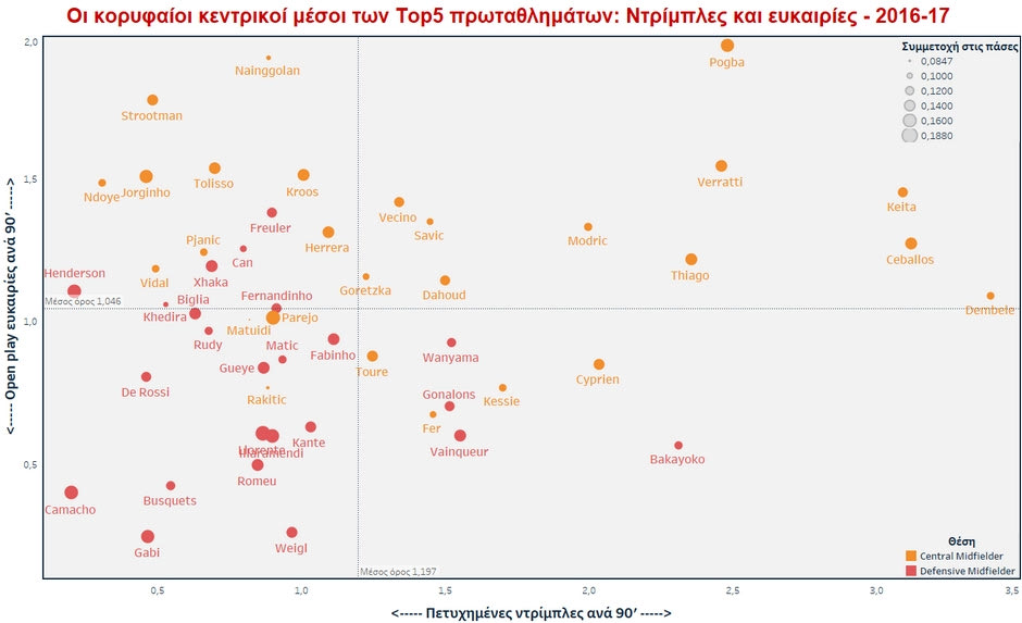 Ποιος μέσος κάνει τις περισσότερες ντρίμπλες, ποιος κερδίζει τα περισσότερα τάκλινγκ και ποιος δημιουργεί τις περισσότερες ευκαιρίες; Πόσο καλή σεζόν έκανε ο Πογκμπά; Γιατί είναι σπάνιος παίκτης ο Ναμπί Κεϊτά και πως ο Τιάγκο διαλύει τα στερεότυπα; Οι 50 καλύτεροι κεντρικοί μέσοι της Ευρώπης μπαίνουν στο μικροσκόπιο και τα γραφήματα έχουν τις απαντήσεις για όλους.