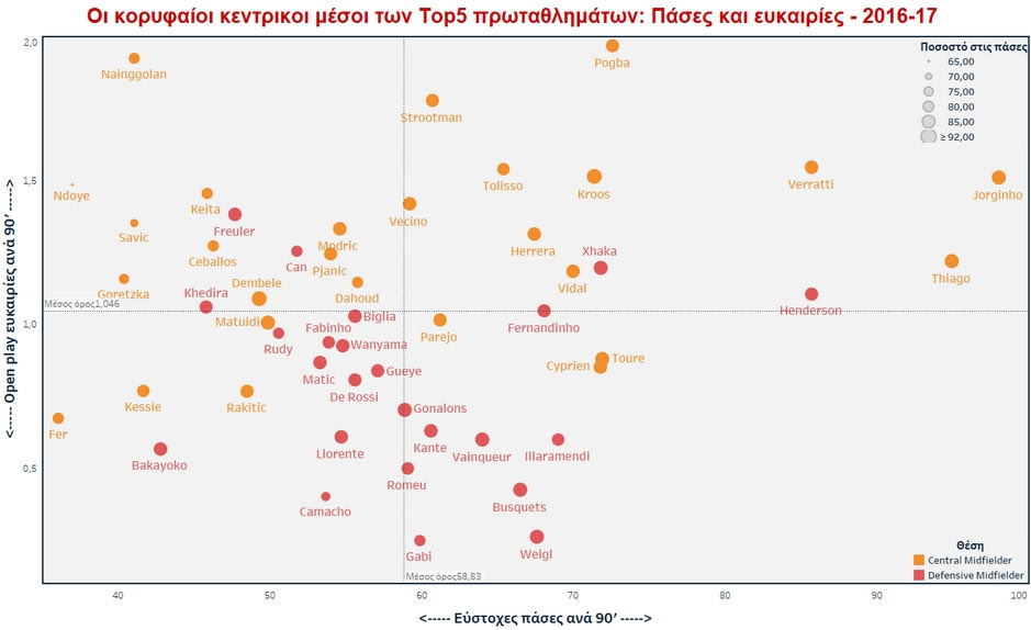 Αφήνουμε σκληράδα και ντρίμπλες, πάμε σε άλλα στοιχεία απαραίτητα για αμυντικούς/κεντρικούς μέσους. Στον οριζόντιο άξονα έχουμε τις εύστοχες πάσες και στον κάθετο τις ευκαιρίες στο open play. Όσο πιο δεξιά είναι ένας παίκτης τόσο πιο πολλές εύστοχες πάσες έχει και όσο πιο ψηλά βρίσκεται τόσο περισσότερες ευκαιρίες δημιουργεί.