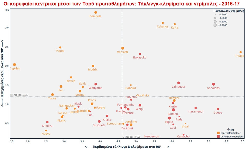 Αυτή τη φορά δεν κοιτάμε γκολ, ασίστ και ευστοχία, αλλά τάκλινγκ, κλεψίματα, ντρίμπλες, πάσες και ευκαιρίες, δηλαδή τους βασικούς τομείς του παιχνιδιού των κεντρικών μέσων. Οι σκέτοι αριθμοί είναι πάντα βαρετοί, γι’αυτό και η απεικόνιση των επιδόσεων θα γίνει με γραφήματα, που θα σας βοηθήσουν με μια ματιά να δείτε τις επιδόσεις των παικτών και να τους συγκρίνετε μεταξύ τους. Οι επιδόσεις των ποδοσφαιριστών αφορούν την προηγούμενη σεζόν και προέρχονται απ’τους αγώνες που έδωσαν μόνο για το πρωτάθλημα σε Αγγλία, Ισπανία, Γερμανία, Ιταλία και Γαλλία.