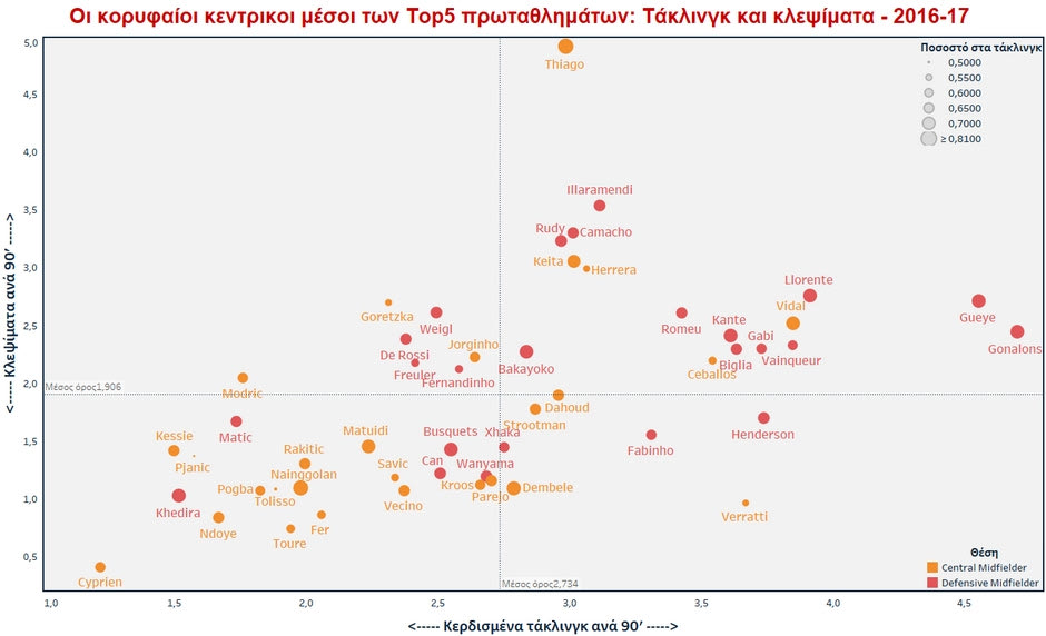 Απαραίτητη σημείωση: κλέψιμο στο ποδόσφαιρο δεν είναι η κερδισμένη μονομαχία, ούτε το διώξιμο. Κλέψιμο έχουμε όταν ένας παίκτης παρεμβαίνει σε μια πάσα των αντιπάλων και γίνεται κάτοχος της μπάλας, ξεκινάει μια καινούργια κατοχή για την ομάδα του. Πάμε να δούμε τους μέσους μας, σημειώνοντας πως το μέγεθος του κύκλου δηλώνει το ποσοστό επιτυχίας στα τάκλινγκ.