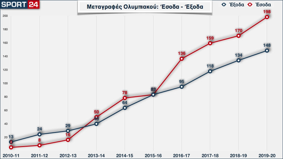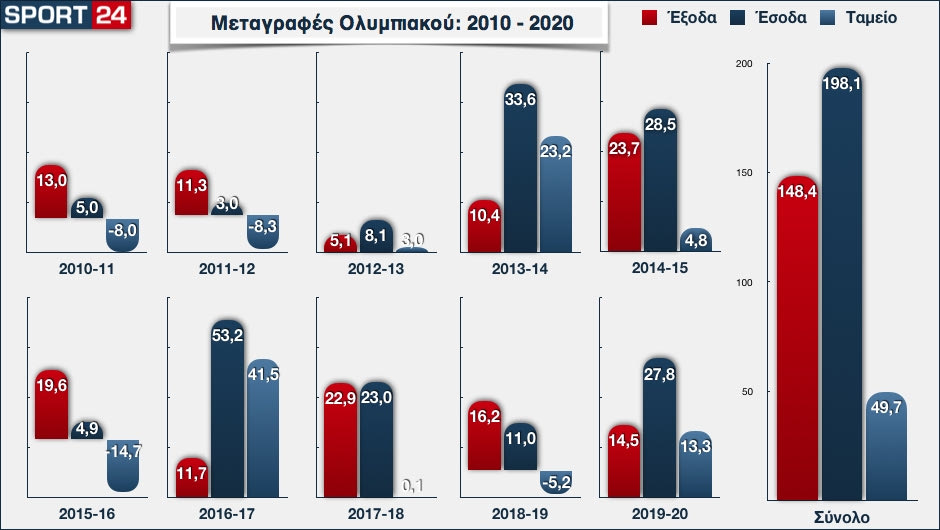 Εύκολα υπολογίζει κανείς πως το πάρε-δώσε, το αγόρασε-πούλα αφήνει εδώ και χρόνια κερδισμένο τον Ολυμπιακό. Οι ερυθρόλευκοι έχουν συν στα ταμεία ένα ποσό που αγγίζει τα 50 εκατομμύρια ευρώ. Από το 2013-14, μόλις στην 4η σεζόν του Μαρινάκη, ο Ολυμπιακός κατάφερε να ισοσκελίσει τα έσοδα-έξοδα των μεταγραφών. Σε όλες τις σεζόν που έχουν ακολουθήσει μέχρι σήμερα, δεν είναι ποτέ “μέσα” όσον αφορά το συνολικό μεταγραφικό ταμείο.