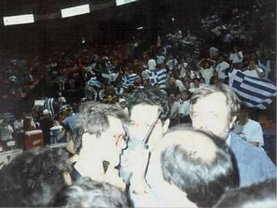Ο αγώνας με τον Καναδά, που εν τέλει μας έστειλε στα ημιτελικά, άρχιζε στις 4 τα ξημερώματα, ώρα Ελλάδας. Θυμάμαι ακόμη τα… κλομπ των Καναδών αστυνομικών, να με σπρώχνουν σε ολόκληρο το δεύτερο ημίχρονο ενώ μετέδιδα το ματς από τις “εγκαταστάσεις του Flash 9.61” όπως ευφυώς είχε βαφτίσει ο συνάδελφος Άρης Νικολάκης τα δυο τεράστια κινητά τηλέφωνα που κάναμε τις μεταδόσεις.