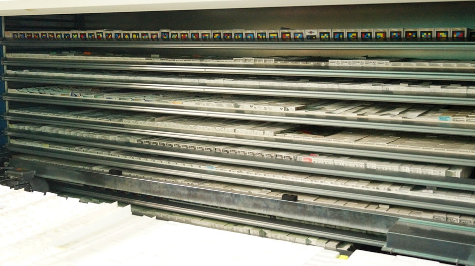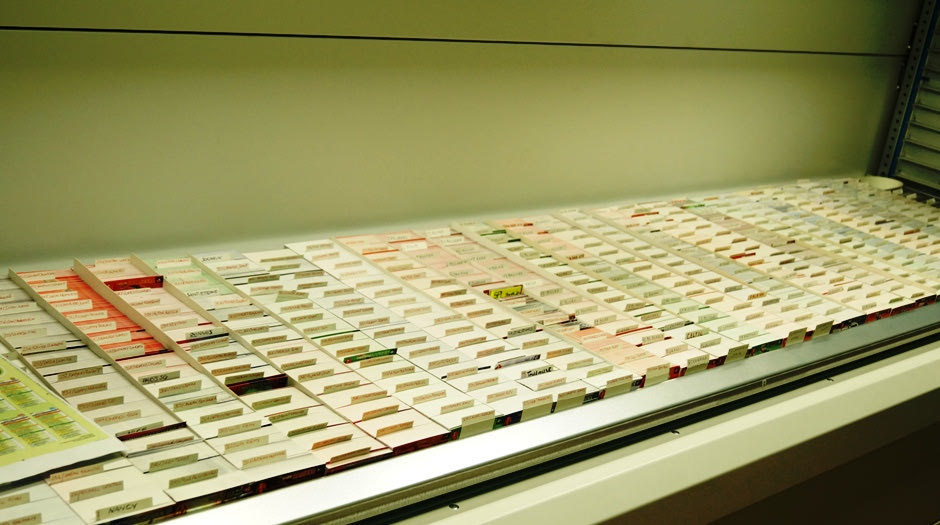 Ο τοίχος του ραφιού άνοιξε (!) για να αποκαλυφθεί μπροστά στα μάτια μου μια μικρή αποθήκη από 10-15 συρτάρια γεμάτα κατηγοριοποιημένα αυτοκόλλητα. Αυτά τα συρτάρια κινούνται σαν ασανσέρ και έρχονται μπροστά στον εργαζόμενο για να βρεθεί το sticker που χρειάζεται ο συλλέκτης. Φανταστείτε λοιπόν 12 ράφια, που στα ενδότερά τους έχουν άλλα 150 συρτάρια. Όποιο αυτοκόλλητο κι αν ψάχνεις, υπάρχει εκεί. Δεν μιλάμε για εκατοντάδες, αλλά για χιλιάδες, πολλές χιλιάδες διαφορετικά stickers, ακόμη και από συλλογές περασμένων δεκαετιών. Αν για παράδειγμα έχεις το album από το Παγκόσμιο Κύπελλο του 1998 και σου λείπει ο Fabien Barthez, μπορείς με ένα απλό γράμμα ή ένα e-mail να το ζητήσεις, να το πάρεις και να συμπληρώσεις τη συλλογή σου.