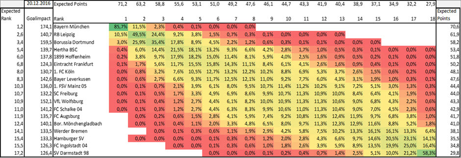 Η Λειψία κρατάει χαμηλά τους τόνους και ως είθισται με ομάδες όπως η Ντόρτμουντ, η Σάλκε και η Λεβερκούζεν, επαναλαμβάνει διαρκώς τη φράση “Wir sind kein Bayern-Jäger” (“δεν είμαστε οι κυνηγοί της Μπάγερν”). Οι αριθμοί διαφωνούν με τους ανθρώπους της ομάδας, αφού μετά από τις πρώτες 15 αγωνιστικές, η πρόγνωση των βαθμών στην τελική κατάταξη τη φέρνει τη δεύτερη θέση με 61,9. Η Ντόρτμουντ βρίσκεται πιο πίσω με 58,2, ενώ Λεβερκούζεν και Σάλκε δεν φαίνονται ούτε να την απειλούν. Μάλιστα, το μοντέλο του ” Goalimpact” δίνει 10,5% πιθανότητες ακόμα και να κατακτήσει τον τίτλο, ενώ οι πιθανότητες να μείνει εκτός τετράδας και Champions League έχουν περιοριστεί σε 6,4%.