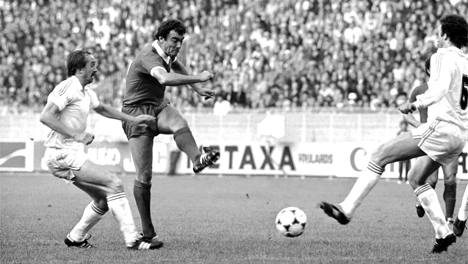 Ο Ρέι Κένεντι σουτάρει ανάμεσα στους Ούλι Στίλικε (αριστερά) και Βιθέντε ντελ Μπόσκε (δεξιά, με το “6”), στη διάρκεια του τελικού του Κυπέλλου Πρωταθλητριών του 1981 (AP Photo/StaffLipchitz)