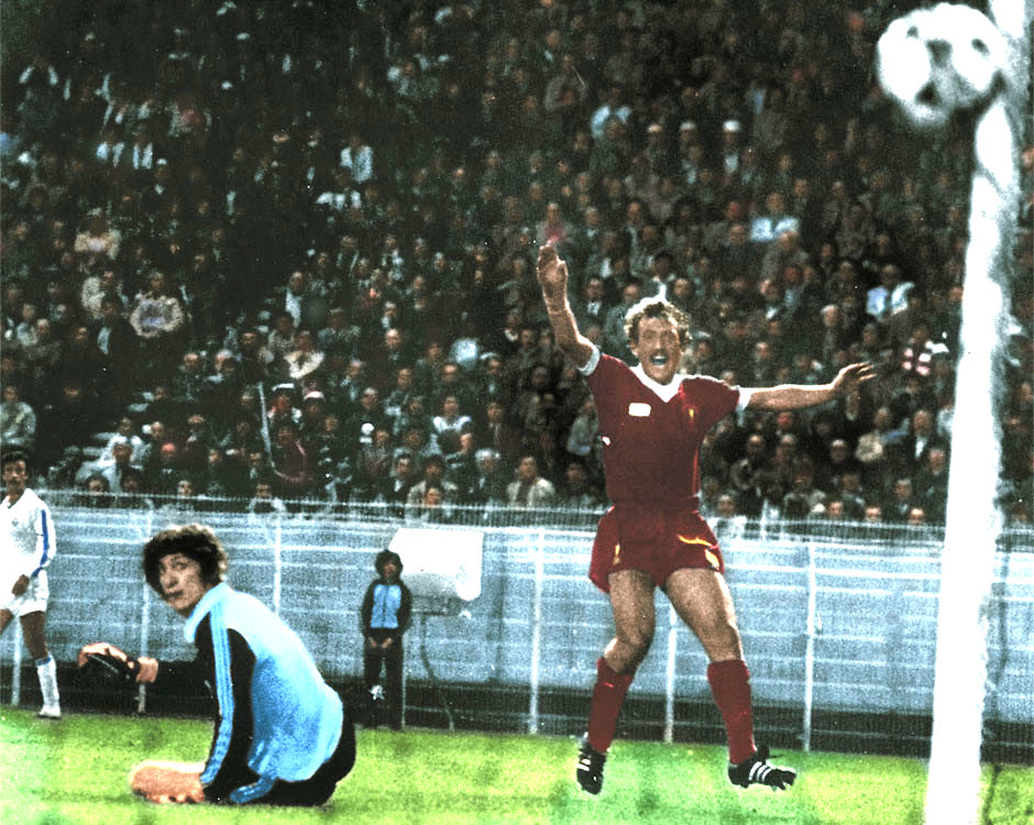 Ο Άλαν Κένεντι έχει σκοράρει και πανηγυρίζει, ο Αγουστίν βλέπει τη μπάλα στα δίχτυα του και στο βάθος αριστερά, διακρίνεται ο Ντελ Μπόσκε. Παρατηρήστε στη φανέλα του Κένεντι το λευκό αυτοκόλλητο στο μέρος όπου υπήρχε το λογότυπο της “Umbro”. Οι παίκτες της Λίβερπουλ υποχρεώθηκαν να το καλύψουν στις φανέλες τους μετά από απαίτηση της UEFA, η οποία τότε απαγόρευε στους τελικούς των διοργανώσεών της την προβολή οποιουδήποτε χορηγού!