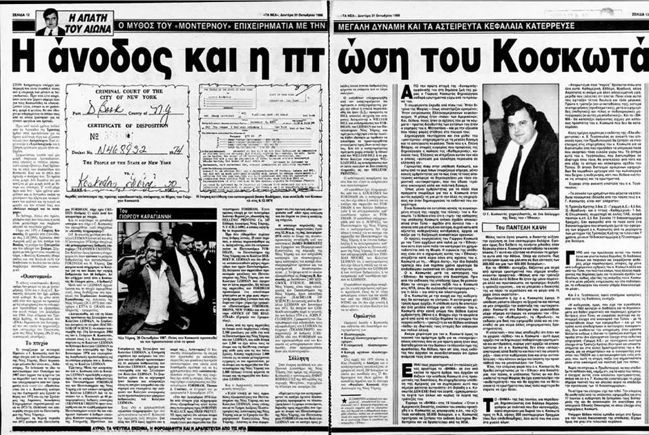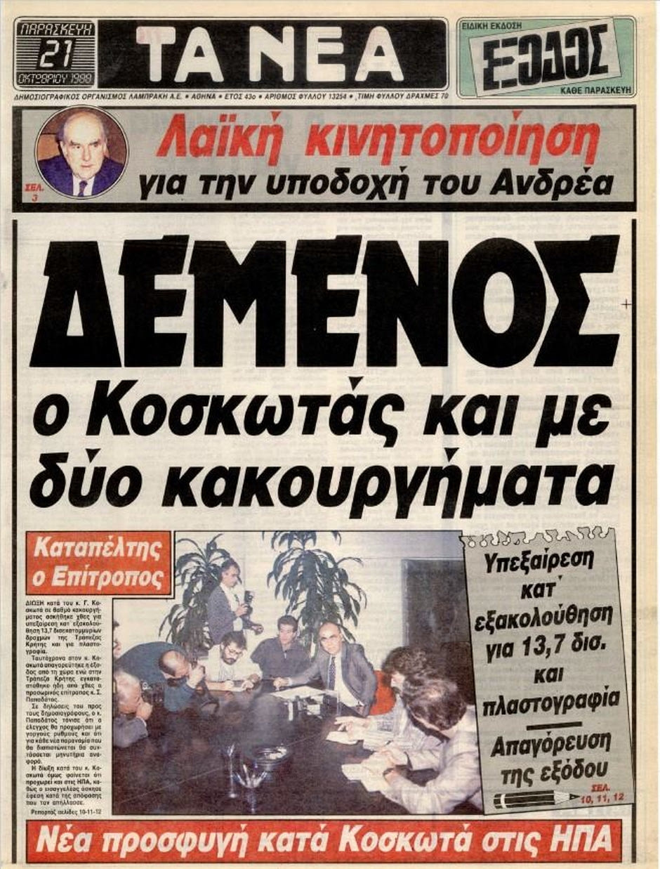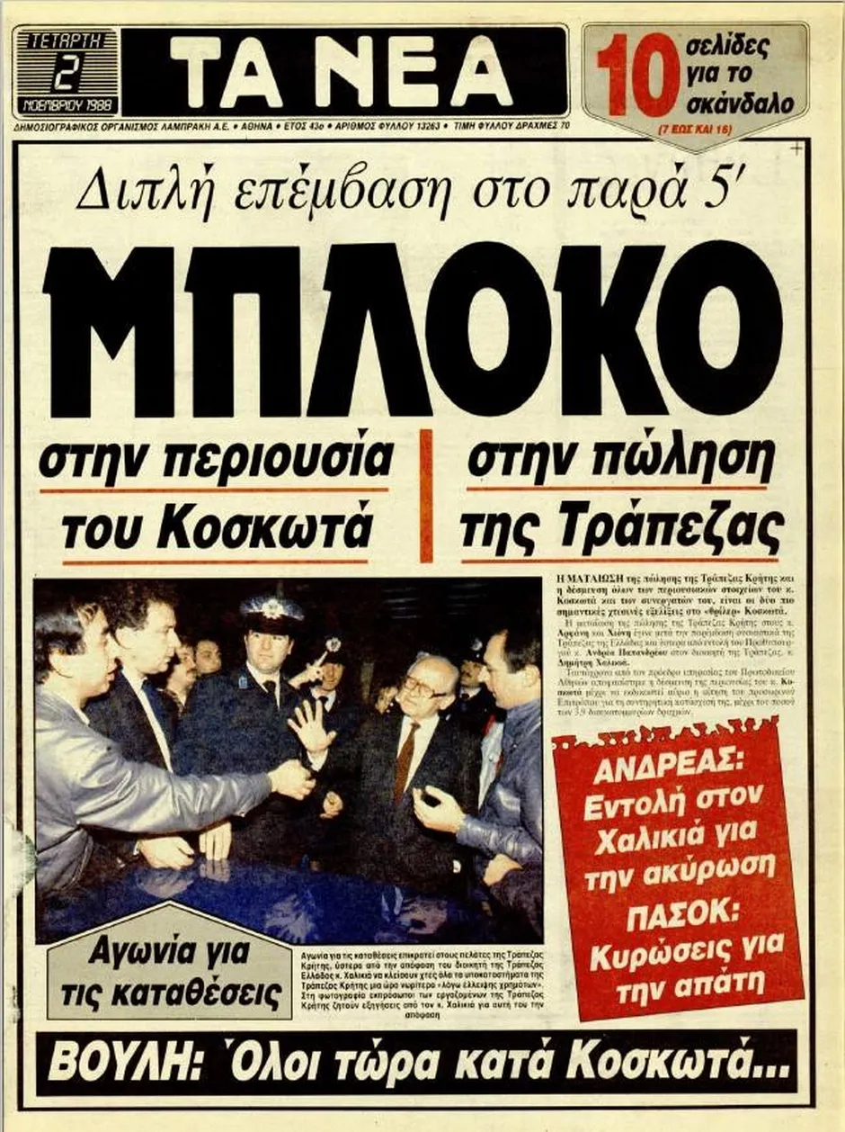 Εν συνεχεία, ξέσπασε το “σκάνδαλο Κοσκωτά”, το οποίο αναφέρθηκε εκτενώς πιο πάνω και το οποίο οδήγησε τον Έλληνα μεγαλοτραπεζίτη πρώτα στο εδώλιο του κατηγορουμένου μαζί με στελέχη της κυβέρνησης του ΠΑΣΟΚ και εν συνεχεία στη φυλακή. Ξεκίνησαν οι επερωτήσεις στη Βουλή και τα δημοσιεύματα πλήθαιναν για το “ποιόν” του Κοσκωτά. Παράλληλα, δόθηκε εντολή για τον έλεγχο της Τράπεζας Κρήτης, ενώ ο τότε υπουργός Παιδείας, Γιώργος Παπανδρέου, κατήγγειλε παράνομες δοσοληψίες του 34χρονου Ελληνοαμερικανού τραπεζίτη με την αμερικανική τράπεζα, Μέριλ Λιντς. Ο κλοιός έσφιγγε επικίνδυνα και τα πράγματα γίνονταν δύσκολα για τον ίδιο, καθώς είχε και μπει εσπευσμένα και ο Ανδρέας Παπανδρέου στο Χέρφιλντ με στένωση αορτής. Πλέον, ήταν μόνος του χωρίς καμία απολύτως κάλυψη, έρμαιος των διαθέσεων των μεγάλων του αντιπάλων που ήθελαν να τον βγάλουν από τη μέση. Ανακαλύπτουν μικροαπάτες με πλαστές ταυτότητες με τις οποίες ζητούσε απ’ το κράτος, φοροαπαλλαγές και επιστροφές χρημάτων, μια αποβολή απ’ το Πανεπιστήμιο της Νέας Υόρκης με την κατηγορία της πλαστογραφίας και το γεγονός ότι καταζητείτο από τις αμερικανικές αρχές. Αν μη τι άλλο, μια καλή βάση για να ξεκινήσει το ψαχτήρι για την δράση του και όλα όσα τον είχαν οδηγήσει τόσο ψηλά μέσα σε πολύ μικρό χρονικό διάστημα.