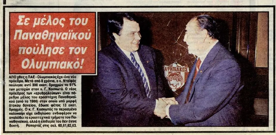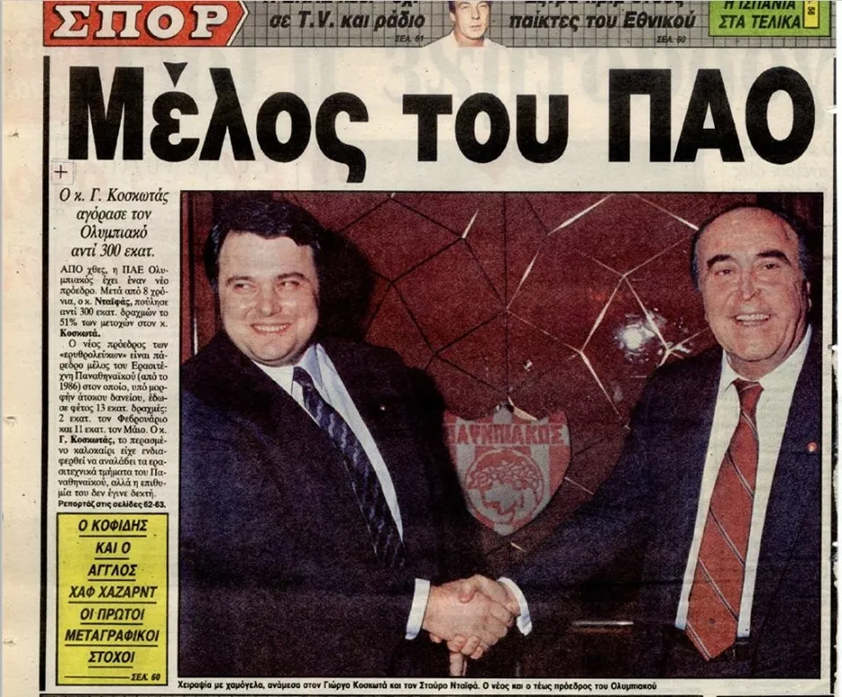 Η πώληση της ΠΑΕ αντιμετωπίστηκε με έκρηξη χαράς από τον κόσμο του Ολυμπιακού, που στο πρόσωπό του έβλεπε έναν άνθρωπο που θα επανέφερε την ομάδα στον δρόμο των επιτυχιών. Ο Κοσκωτάς είχε προσπαθήσει να μπει στην αγαπημένη του ομάδα, τον Παναθηναϊκό, αλλά και στην ΑΕΚ, δίχως να τα καταφέρει. Μετά τη μεσολάβηση κάποιων πολιτικών της τότε Κυβέρνησης του ΠΑΣΟΚ, πείστηκε να αγοράσει τον Ολυμπιακό. Στη συνέντευξη Τύπου, δήλωσε δημοσίως πως έβλεπε το “τριφύλλι” από μικρός, αφού ήταν συγγενής με τον παλαίμαχο του Παναθηναϊκού, τον Παπαντωνίου. Ο Μιλτιάδης Μαρινάκης, πατέρας του Βαγγέλη, αρνήθηκε να παραχωρήσει στον Κοσκωτά τις μετοχές της ΠΑΕ που είχε στα χέρια του. Όλοι οι μεγαλοεκδότες εκείνης της περιόδου, πολέμησαν τον Κοσκωτά εξαιτίας και της δικής του εμπλοκής με τη “Γραμμή Α.Ε.”, θέλοντας να τον αποδομήσουν και να μην κερδίσει το έρεισμα των εκατομμυρίων φιλάθλων του Ολυμπιακού. Η δική του… απάντηση στον πόλεμο που δεχόταν, ήταν να ξεκινήσει να αγοράζει τον έναν παίκτη μετά τον άλλον, δημιουργώντας και τα περιβόητα χρέη δισεκατομμυρίων που ξεπλήρωσε εντέλει ο Σωκράτης Κόκκαλης.