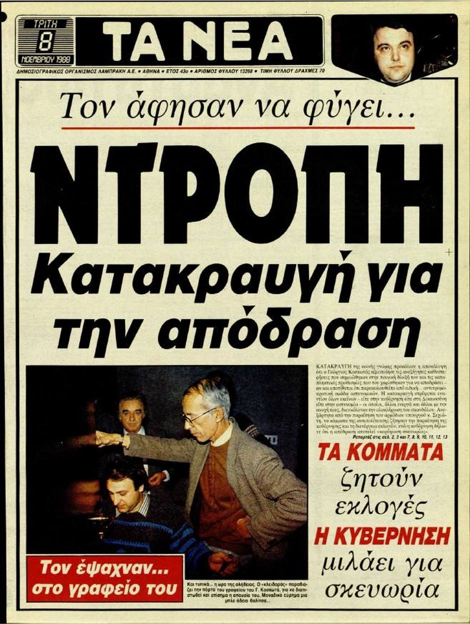 Οι εκδότες των υπόλοιπων μεγάλων ελληνικών εφημερίδων μόνο βολικά δεν ένιωθαν με την παρουσία του, δεν μπορούσαν να πιστέψουν αυτό που συνέβαινε. Ένας τραπεζίτης 34 ετών, είχε γίνει ο απόλυτος πρωταγωνιστής και οι ίδιοι έπαιζαν το ρόλο του κομπάρσου. Έτσι, λοιπόν, δημιούργησαν μέτωπο εναντίον του και άρχισαν να καταγγέλλουν ότι τα χρήματα που ξόδευε, ήταν προϊόν ύποπτων συναλλαγών και σε καμία περίπτωση δικά του. Τον Οκτώβριο του 1987, άρχισαν να έρχονται στο φως αποκαλύψεις για το παρελθόν του Κοσκωτά. Πλαστογραφίες, φορολογικά αδικήματα, παράνομη εξαγωγή συναλλάγματος και πολλά ακόμη. Παρά τις καταγγελίες, η κυβέρνηση δεν κίνησε διαδικασίες για φορολογικό έλεγχο. Τον Ιούλιο του 1988, διατάχθηκε -με εισαγγελική παρέμβαση- τοποθέτηση προσωρινού επιτρόπου και άρση τραπεζικού απορρήτου στην Τράπεζα Κρήτης, προκειμένου να διεξαχθεί η έρευνα. Όμως ένα μήνα αργότερα, ο τότε υπουργός Δικαιοσύνης, Μένιος Κουτσόγιωργας έφερε τροπολογία στη Βουλή, η οποία άφηνε προνομιακά περιθώρια στον Κοσκωτά, ο γνωστός και ως “Κουτσονόμος” (Νόμος 1806/1988). Για το Νόμο αυτό, αποκαλύφθηκε αργότερα ότι το αντάλλαγμα ήταν η κατάθεση 2.000.000 δολαρίων στο όνομα του Μένιου Κουτσόγιωργα σε ελβετική τράπεζα. Παρ’ όλα αυτά, το δικαστικό πόρισμα αποκάλυψε ότι ο Κοσκωτάς είχε προχωρήσει σε υπεξαίρεση κεφαλαίων από την τράπεζα Κρήτης ύψους 33.500.000.000 δραχμών. Ο επιχειρηματίας διέφυγε στο εξωτερικό (αρχικά στην Βραζιλία και μετά στις ΗΠΑ) και συνελήφθη αργότερα από τις αμερικανικές αρχές.