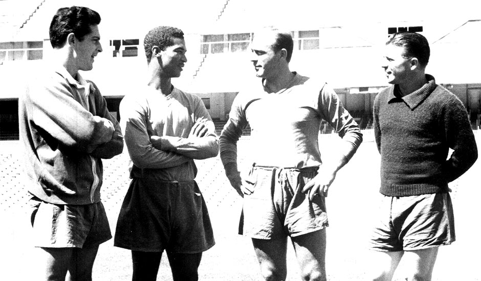 Η Ρεάλ Μαδρίτης είναι η ομάδα με τα περισσότερα πρωταθλήματα (33) στην ιστορία της Primera División. Εδώ τέσσερις μεγάλες δόξες των “μερένγκες” το 1959. Από αριστερά, Έκτορ Ριάλ, Ντιντί, Αλφρέδο Ντι Στέφανο και Φέρεντς Πούσκας (AP Photo/File)