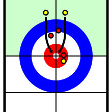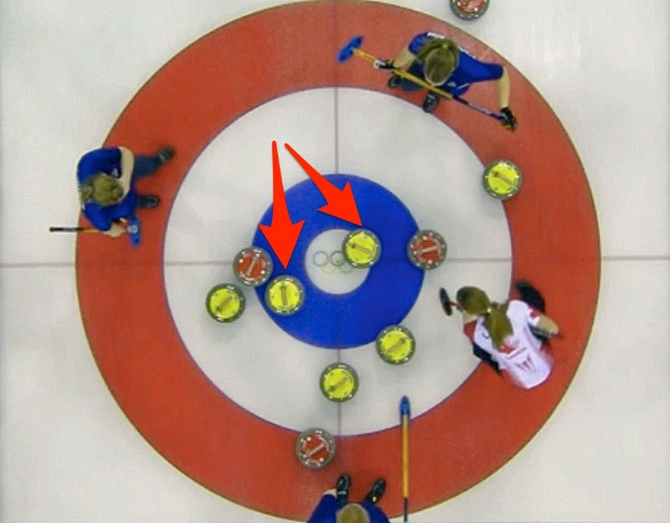 Ας υποθέσουμε ότι μια ομάδα έχει κίτρινες πέτρες και η αντίπαλη τις κόκκινες πέτρες, όπως στην παρακάτω φωτογραφία. Όπως βλέπετε, οι δυο κίτρινες πέτρες είναι σε καλύτερη θέση ως προς το κέντρο του κουμπιού σε σχέση με την καλύτερη αντίπαλη πέτρα. Άρα, η ομάδα που ρίχνει με τις κίτρινες πέτρες, στην συγκεκριμένη περίοδο παίρνει δυο πόντους. Στόχος των ομάδων είναι να απομακρύνουν τις αντίπαλες πέτρες από το “σπίτι” ή να δυσκολέψουν την δίοδο σε αυτό. Γι’ αυτό και το Curling ονομάζεται “σκάκι στον πάγο”. Θέλει πολύ μελετημένες βολές και ένα λάθος χτύπημα μπορεί να χαλάσει όλο το πλάνο και την τακτική που έχει αποφασιστεί.