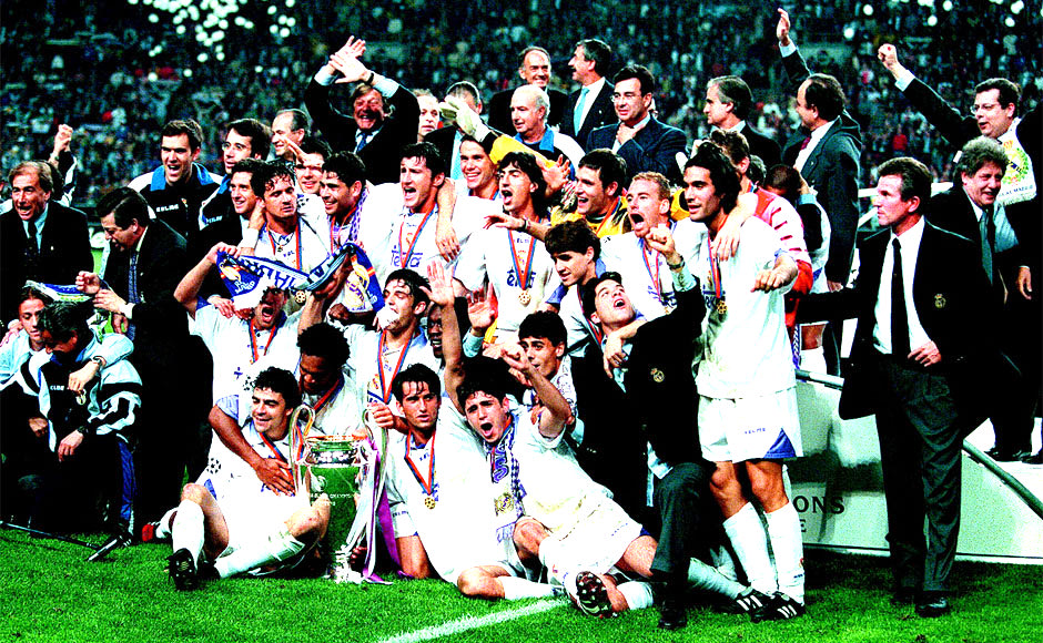 Ο Γιουπ Χάινκες (δεξιά) και οι παίκτες της Ρεάλ με την séptima στην Amsterdam Arena (20/5/1998)