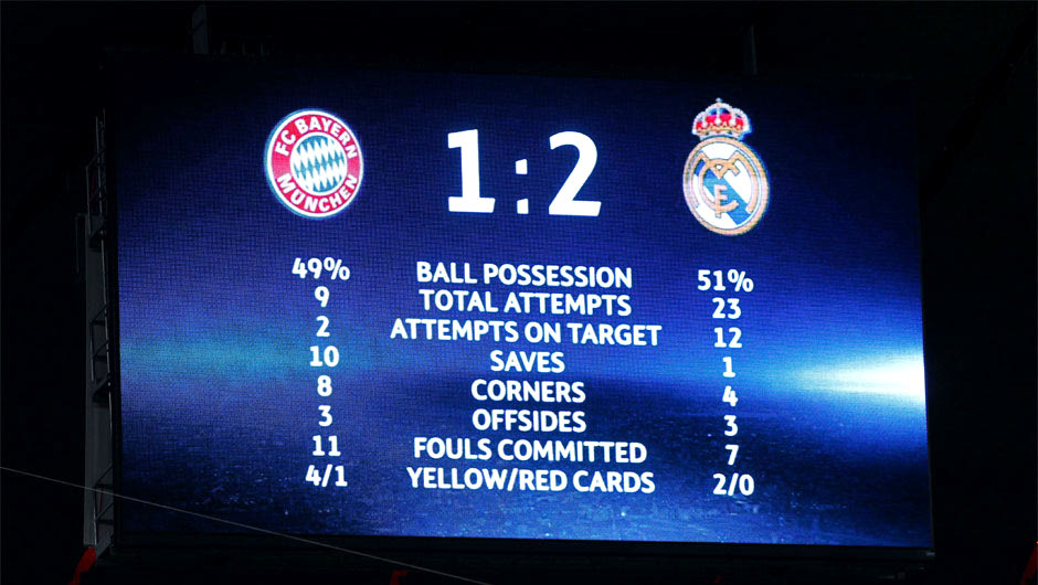 Ο φωτεινός πίνακας του “Allianz Arena” μετά τον περσινό προημιτελικό, με τα στατιστικά της συνάντησης. Η υπεροχή της Ρεάλ στην επίθεση ήταν σαρωτική.