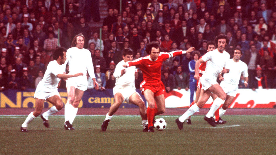 Η πρώτη φορά που Ρεάλ και Μπάγερν βρέθηκαν αντιμέτωπες στην Ευρώπη, στα ημιτελικά του Πρωταθλητριών το 1976. Ο Μπέκενμπαουερ με τη μπάλα, δεξιά του ο Ντελ Μπόσκε, πίσω του ο Καμάτσο και αριστερά από τον Καμάτσο, ο Γκίντερ Νέτσερ.