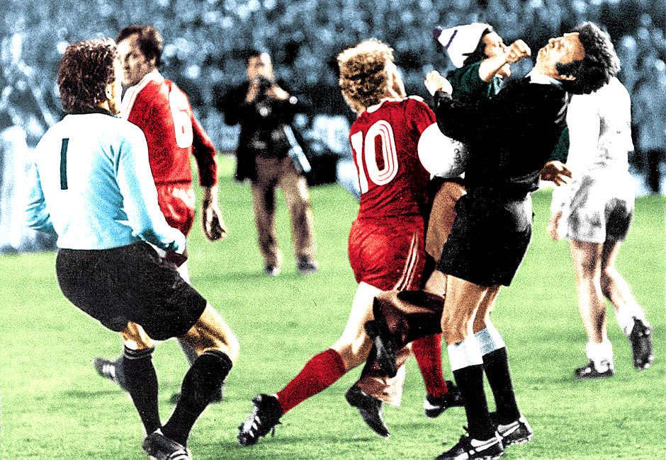 Ο “τρελός του Μπερναμπέου” μόλις έχει χτυπήσει τον διαιτητή παρά την προσπάθεια του Χένες (10) να τον σταματήσει, ενώ ο Μάγερ (1) είναι έτοιμος να επέμβει!