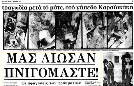 Ολοι κατέβαιναν τρέχοντας τις σκάλες και δυστυχώς οι φωνές ενθουσιασμού μετατράπηκαν σε κραυγές αγωνίας και πόνου, καθώς οι υπεύθυνοι του Σταδίου δεν είχαν μεριμνήσει να ανοίξουν τις πόρτες. Οι πρώτοι προσπαθούσαν να φωνάξουν σε αυτούς που ακολουθούσαν κατά κύματα, αλλά μέσα στην απαράμιλλη χαρά κανείς δεν μπορούσε να ακούσει τίποτα. Ο χάρος παραμόνευε. Οι σκηνές που ακολούθησαν ήταν τραγικές. Εκατοντάδες άτομα στοιβαγμένα μπροστά σε σίδερα να ασφυκτιούν. Κανείς δεν μπορούσε να ακούσει τις κραυγές πόνου.