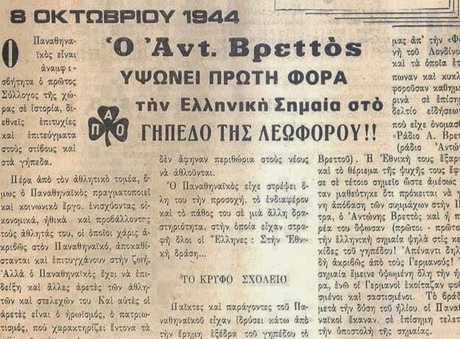 “Την προσεχή Κυριακή μέγας ποδοσφαιρικός αγών Παναθηναϊκού – Αγγλικής Αεροπορίας. Ζήτω η Ελευθερία”. έγραφε η ανακοίνωση που διάβαζαν και οι φυλακισμένοι από απέναντι, αλλά μεγαλύτερο κουράγιο από όλα τους είχε δώσει η έπαρση της ελληνικής σημαίας στις 8 Οκτωβρίου του 1944, λίγο πριν από την αποχώρηση των Γερμανών. Μάλιστα, ο Βρεττός είχε μετατρέψει κάποιους χώρους της Λεωφόρου σε χώρους Αντίστασης και σε παράνομες συγκεντρώσεις φίλοι του Παναθηναϊκού και όχι μόνο μάθαιναν τα νέα από “λαθραία” ραδιόφωνα.