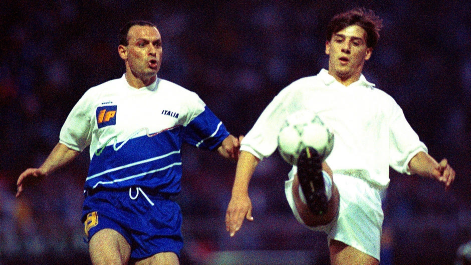 Τελειώνει το παιχνίδι στο ΟΑΚΑ με τον Παναθηναϊκό και έρχεται στα αποδυτήρια ο υπεύθυνος της ομάδας και μού λέει: ‘Μικρέ, δεν θα πας με την Ελπίδων. Σε κάλεσε ο Αντώνης Γεωργιάδης στην Ανδρών’. Παγώνω. Δεν ήξερα τι να πω. Ήταν, βέβαια, ωραίο το συναίσθημα. Υπήρχε προφανώς άγχος, αλλά ήταν ωραία. Μάλιστα, ο Γεωργιάδης με έβαλε βασικό κόντρα στην Ιταλία. Σκέψου, έπαιζα απέναντι στον Ρομπέρτο Μπάτζιο, ο οποίος θεωρείτο τότε ανερχόμενο αστέρι στην Ιταλία. Ήμασταν σχεδόν συνομήλικοι”.