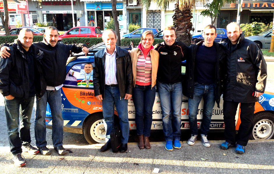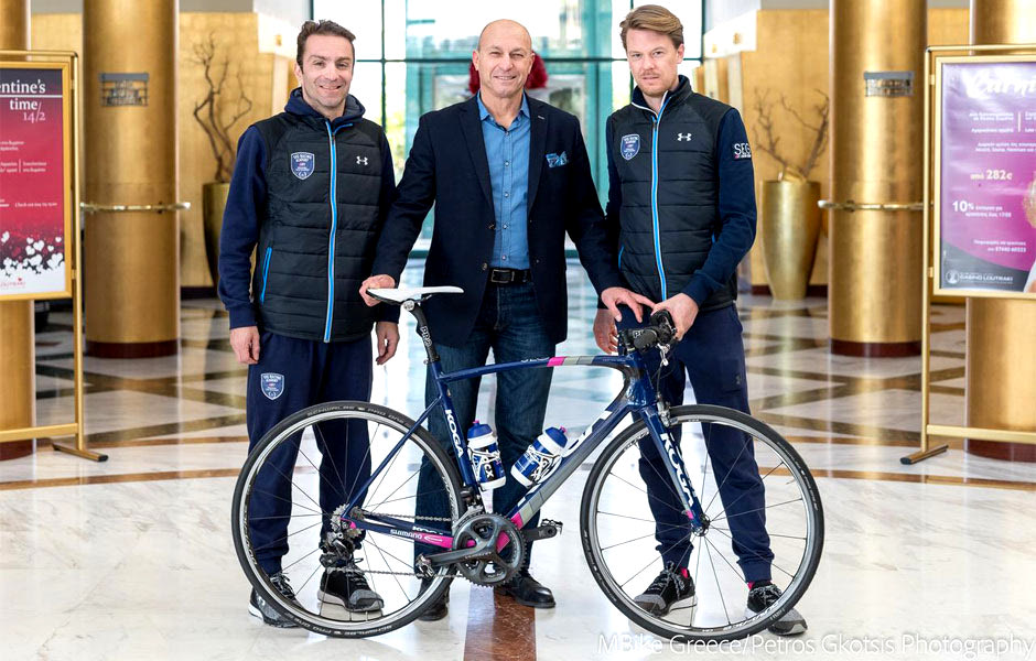 Ο Βασίλης Αναστόπουλος και ο Eelco Berkhout (αδερφός του Μάρταϊν και συνιδιοκτήτης της SEG Racing Academy) με τον δήμαρχο Λουτρακίου Γιώργο Γκιώνη (κέντρο) και το ποδήλατο που του δώρισε η ομάδα για τις μετακινήσεις του, στο Club Hotel Loutraki (χώρο διαμονής της SEG στις προετοιμασίες) τον περασμένο Φεβρουάριο