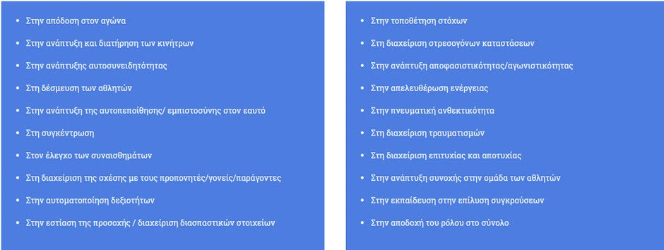 *Ενισχύει τους αθλητές και βοηθά στην αντιμετώπιση καταστάσεων στην καθημερινή τους ζωή, το σχολείο, τη σχέση με τους συνομηλίκους τους και τις οικογένειές τους