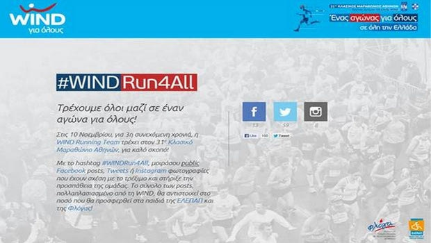 Με αυτό τον μηχανισμό η WIND δίνει στους χρήστες των δημοφιλέστερων social media τη δυνατότητα να συμμετέχουν κι εκείνοι στον 31ο Κλασικό Μαραθώνιο Αθηνών, έναν αγώνα που η WIND έχει αναδείξει σε Αγώνα για Όλους, στέλνοντας ένα μήνυμα κοινωνικής αλληλεγγύης μέσω του αθλητισμού.