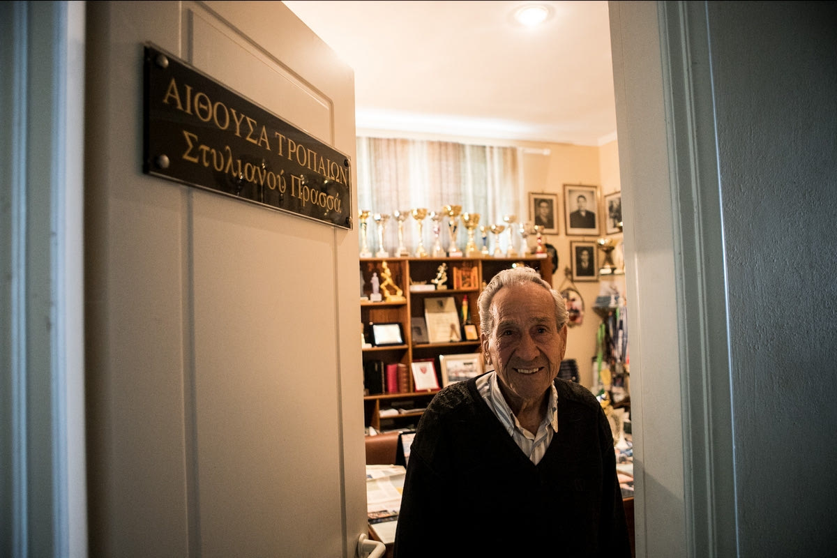Όταν ταξιδεύουμε για τους αγώνες, μόλις τελειώσουμε τρέχουν όλοι να πάρουν το σουβλάκι τους, το ένα, το άλλο. “Ο Πρασσάς τι θα φάει;” ρωτάνε και λένε “Θα φάει καμιά σπανακόπιτα”. Αυτό είναι το φαγητό μου. Με έχουν μάθει. Και παίρνω και μαζί μου φαγητό, για να φάω σωστά. Τρώω βραστά όλα τα φαγητά. Μαγειρευτά και δεν γεμίζω ποτέ το πιάτο. Σαλάτα δεν τρώω, μόνο ντομάτα κόβω. Ο γιατρός λέει θες να σου βάλω μια ταμπέλα απ’ έξω που να λέει “Ο 90χρονος που δεν έχει τίποτε”; Κάνω εξετάσεις κάθε έξι μήνες. Είναι απαραίτητες”.