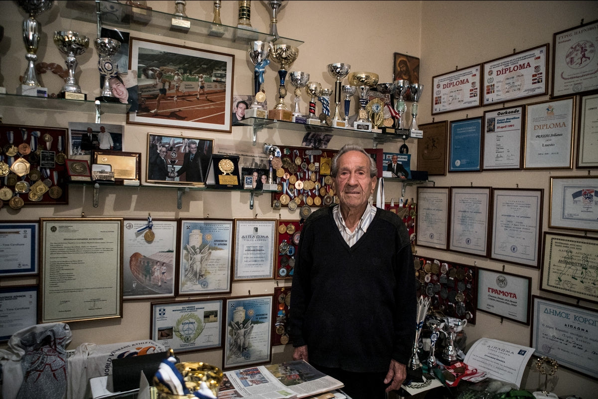 Έχω αγωνιστεί στο Μπάφαλο και έχω τερματίσει στους Καταρράκτες του Νιαγάρα. Στην Αυστραλία, επίσης. Τότε, έτρεξα στο Μπρισμπέιν. Μέχρι και τις Σεϋχέλλες έχω φτάσει. Έχω αγωνιστεί στην Ταϊλάνδη, στο Τορόντο, στην Ουγγαρία, στη Σμύρνη, στη Σλοβενία, στη Σερβία, σε όλα τα Βαλκάνια έχω πάει. Στα Βαλκάνια δεν με κερδίζει κανείς, στις μεγάλες αποστάσεις. Στις ηλικιακές κατηγορίες εννοώ, δεν περνάω τους 20άρηδες. Μην μπερδευτείς. Αστείο πράγμα να πω ότι θα περάσω 20 χρονών παιδιά. Κοίτα εδώ στο Μόναχο. Δες στιλ”, είπε και έδειξε μια από τις φωτογραφίες του στην αίθουσα τροπαίων που έχει δημιουργήσει στο σπίτι του, στον Μαραθώνα. “Δες διασκελισμό. Δεν γίνεται να χάσεις με τέτοιο διασκελισμό! Εδώ, έχω περισσότερα από 90 μετάλλια και στο Μουσείο του Μαραθώνα έχω πάει τα ευρωπαϊκά. Τα έχουν σε βιτρίνα με τα κύπελλά μου και την εμφάνισή μου. Αγωνίζομαι με τον Τελμησσό, τώρα. Όμως, άρχισα να τρέχω όταν ήμουν 60 ετών με τους Βετεράνους Αθλητές του Στίβου”.