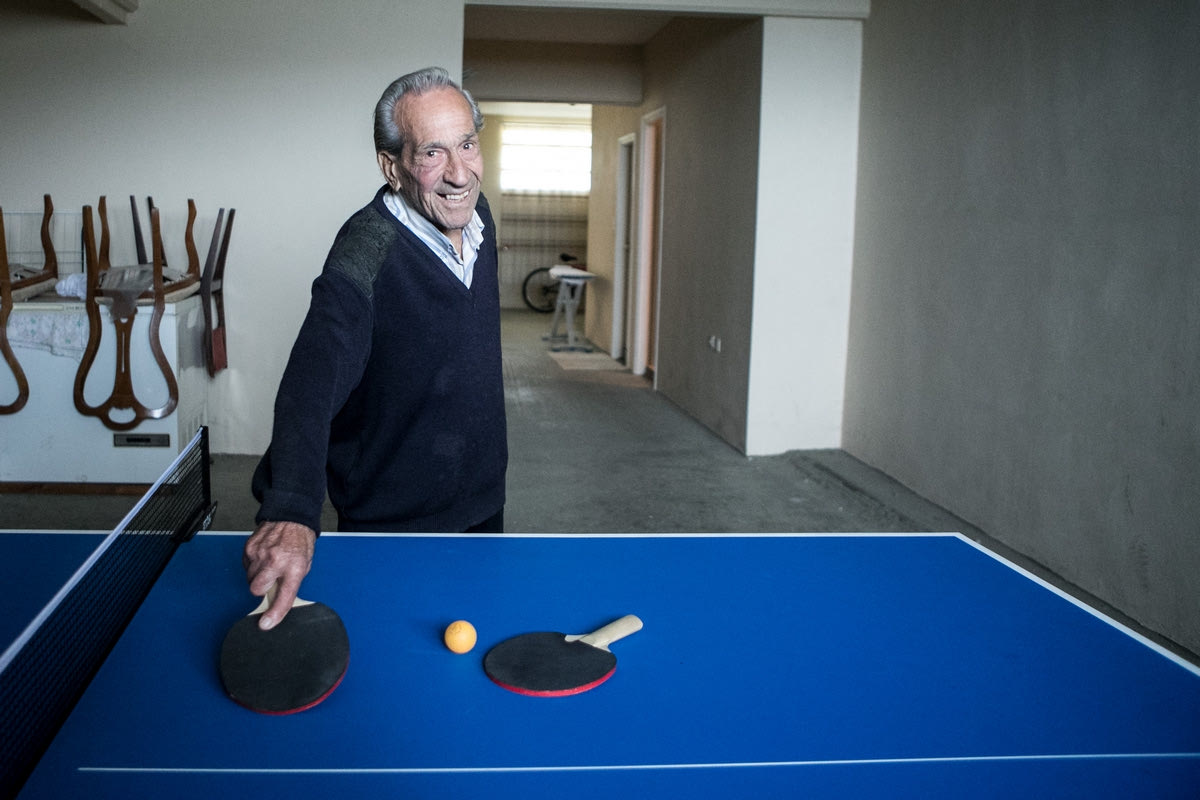 “Το χαμόγελο, δεν μου λείπει εμένα”, είπε και βγήκε τρέχοντας (!) έξω από το σπίτι, για τη φωτογράφιση. Ένας 90χρονος σίφουνας που προτιμά το τρέξιμο από το περπάτημα. Βρίσκεται σε διαρκή κίνηση. Στα μισά της συνέντευξης, σηκώθηκε από την καρέκλα του και συνέχισε να μιλάει όρθιος. “Δες εκεί. Έχω και μπασκέτα. Πιο πέρα, παίζουμε ποδόσφαιρο με τα εγγόνια μου. Ο Στελάκης είναι μεγάλος ποδοσφαιριστής. Παίζει ποδόσφαιρο, όπως έπαιζα εγώ. Αλλά, είναι αμυντικό χαφ. Τον δοκίμασε και η ΑΕΚ, στο Κορωπί. Είναι 14άρων ετών. Έχει πάρει το δικό μου γονίδιο και θα γίνει και καλύτερος. Τις προάλλες χτύπησε την μπάλα 266 φορές, δίχως να του πέσει κάτω. Έτσι: τακ, τακ, τακ. Κι εγώ ήμουν δίπλα και μετρούσα πόσα χτυπήματα θα κάνει χωρίς να ακουμπήσει η μπάλα στη γη. Νομίζω, θα τιμήσει την Ελλάδα μας. Και είναι και πρώτος μαθητής. Όλο 20 παίρνει. Τώρα, μαθαίνω ότι τα παιδιά έχουν προπόνηση στις 10 το βράδυ. Εμείς δεν το κάναμε ποτέ αυτό, βέβαια δεν είχαμε και φως, τέτοια ώρα. Το 1950 ήρθε το ρεύμα στη Γούβα, στον Άγιο Αρτέμιο. Με κεριά ήμασταν και τα ψυγεία μας ήταν με πάγο. Περνούσε ο παγοπώλης”.