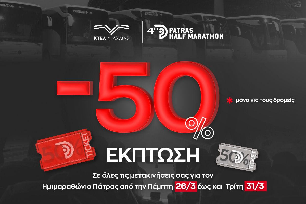 Το υπεραστικό ΚΤΕΛ Αχαΐας προσφέρει έκπτωση -50% στις μετακινήσεις των δρομέων και ενός συνοδού για τον 4ο Διεθνή Ημιμαραθώνιο Πάτρας