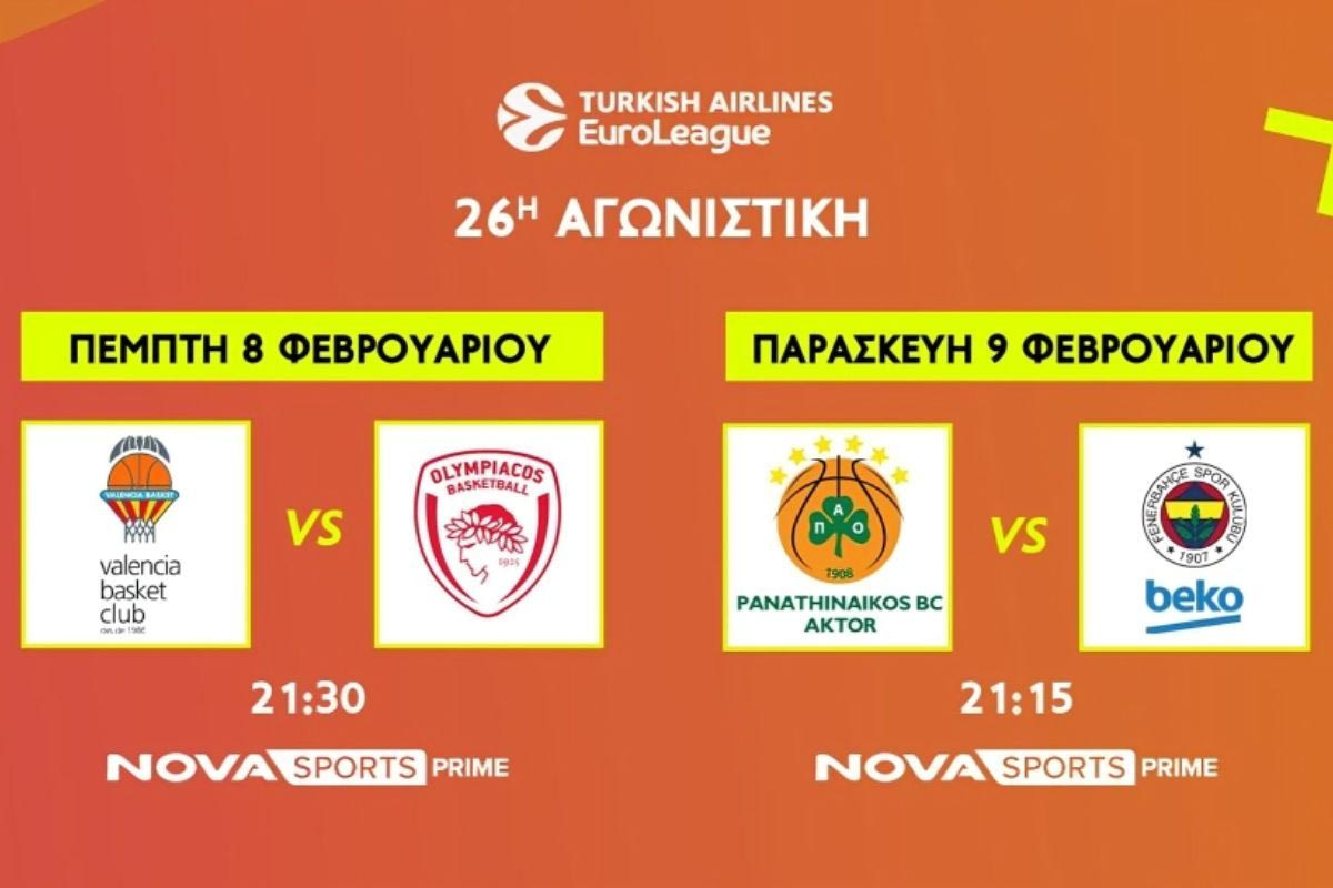 Με αμείωτη ένταση και συναρπαστικές αναμετρήσεις συνεχίζεται το μπασκετικό υπερθέαμα στο παρκέ του Novasports με EuroLeague και τους «αιωνίους», με EuroCup και τον Άρη καθώς και με NCAA αλλά και FIBA Women’s Olympic Qualifying Tournament! Στην EuroLeague, την κορυφαία ευρωπαϊκή διασυλλογική διοργάνωση στο χώρο του μπάσκετ, δεσπόζουν οι αγώνες Βαλένθια – Ολυμπιακός (8/2, 21:30) & Παναθηναϊκός AKTOR – Φενέρμπαχτσε (9/2, 21:15) στο πλαίσιο της 26ης αγωνιστικής. Παράλληλα, οι φίλοι του μπάσκετ θα απολαύσουν LIVE και όλους τους υπόλοιπους αγώνες της EuroLeague με το ενδιαφέρον να στρέφεται στους αγώνες Αρμάνι Μιλάνο-Ρεάλ Μαδρίτης Αναντολού Εφές-Μακάμπι Τελ Αβίβ, Παρτίζαν-Μπάγερν Μονάχου, Βίρτους Μπολόνια-Μονακό.