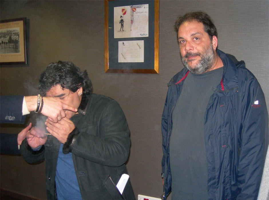 Σαν σε όνειρο κατευθύνομαι προς τον Ντιέγκο και στέκομαι δίπλα του. Τον παρακολουθώ να ανάβει το πούρο του και νιώθω την καρδιά μου να χτυπάει σαν ρούλο σε ταμπούρλο. Πείτε με γραφικό – περισσότερο και από την Φολέγανδρο αν θέλετε – όμως ζω την απόλυτη έκσταση. Δείτε τα μούτρα μου στη φωτογραφία, είναι ένα ποίημα! Το πούρο ανάβει, ο Ντιέγκο παίρνει την πρώτη τζούρα και εκείνη τη στιγμή ο πρόεδρος κάνει τις συστάσεις: «Ντιέγκο, εδώ είναι ο δημοσιογράφος που σου είπα. Λέγεται… Πώς είπαμε ότι σας λένε;»
